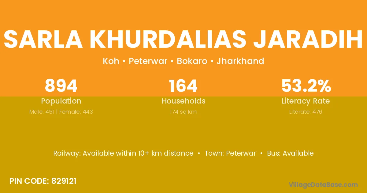 Sarla Khurdalias Jaradih village has a total population of 894 people, of which 451 are males and 443 are females.