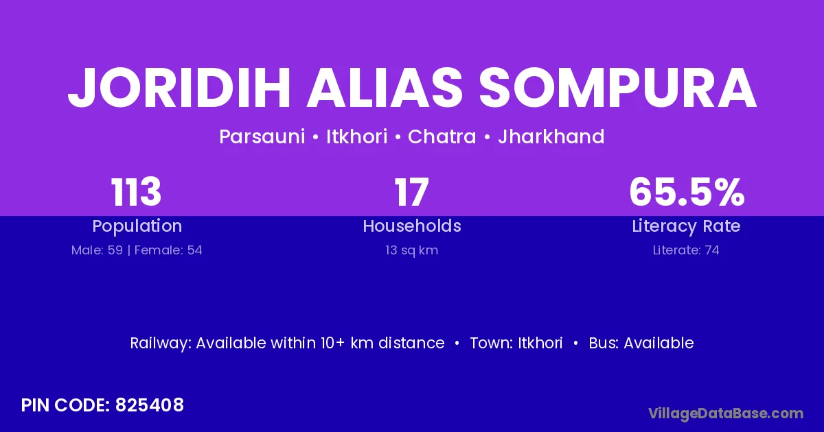 Joridih Alias Sompura village has a total population of 113 people, of which 59 are males and 54 are females.