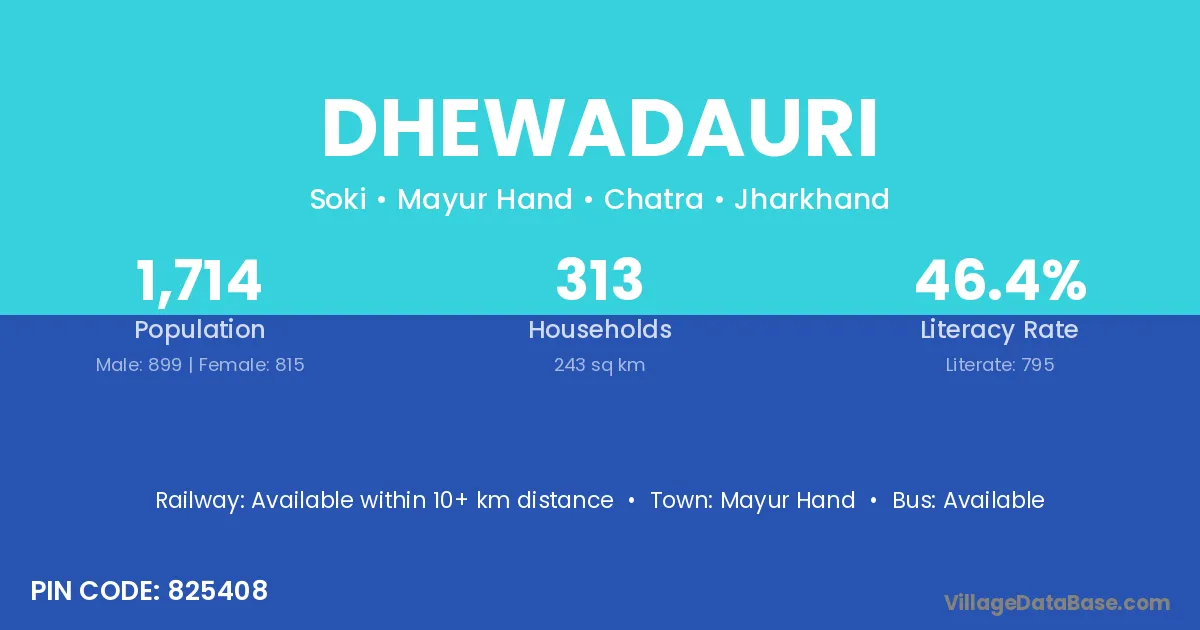 Dhewadauri village has a total population of 1,714 people, of which 899 are males and 815 are females.