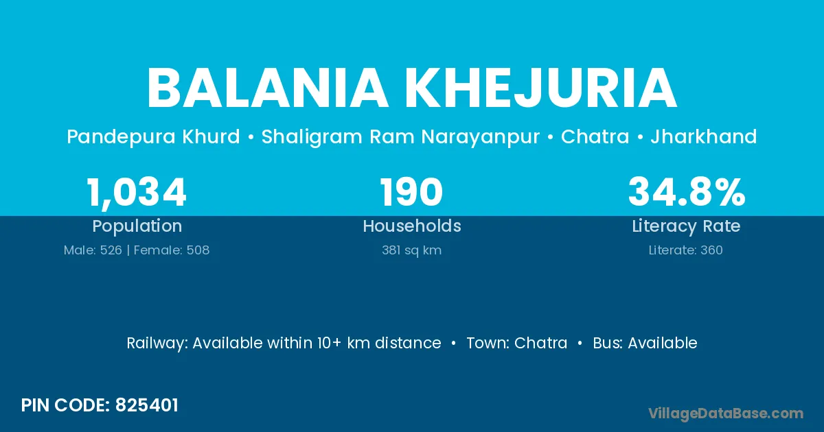 Balania Khejuria village has a total population of 1,034 people, of which 526 are males and 508 are females.