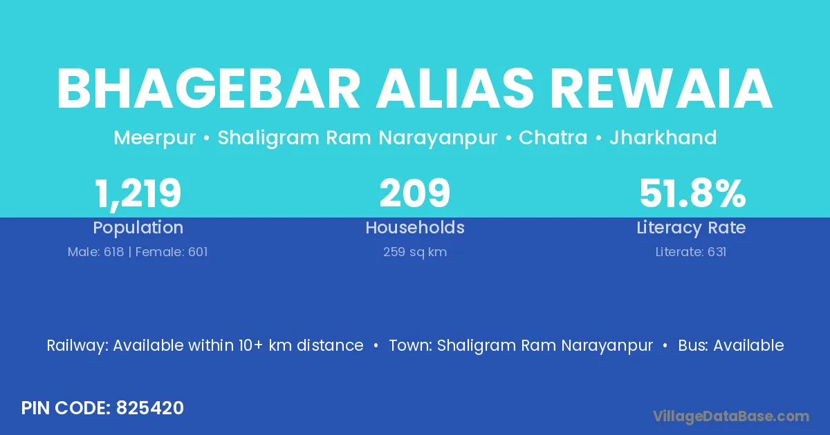Bhagebar Alias Rewaia village has a total population of 1,219 people, of which 618 are males and 601 are females.