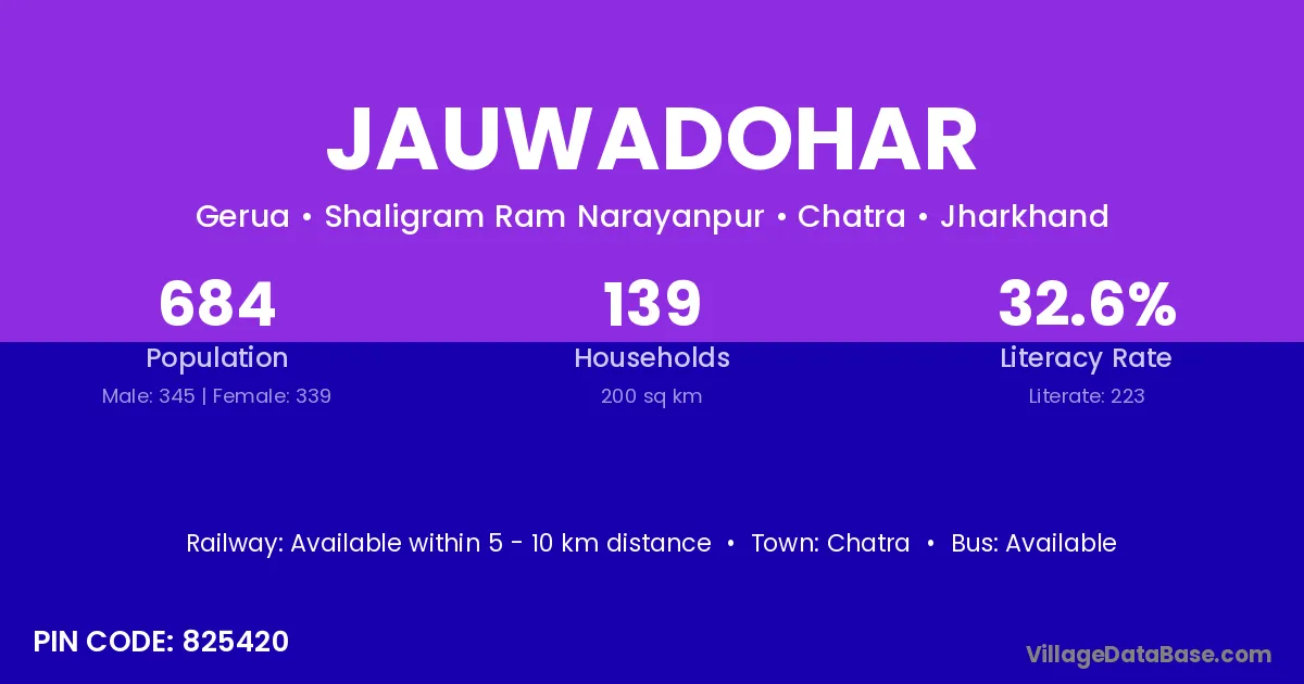 Jauwadohar village has a total population of 684 people, of which 345 are males and 339 are females.