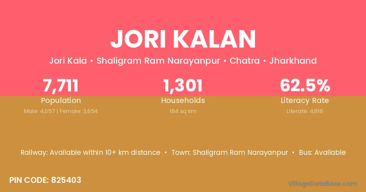Jori Kalan village has a total population of 7,711 people, of which 4,057 are males and 3,654 are females.