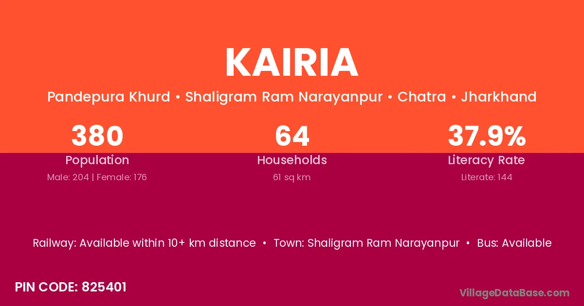 According to Census 2011 information, the village code of Kairia village is 825401.