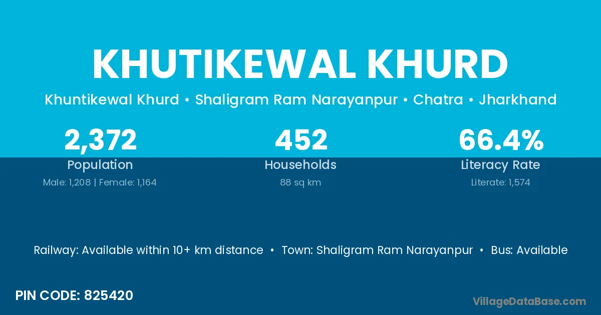 Khutikewal Khurd village has a total population of 2,372 people, of which 1,208 are males and 1,164 are females.