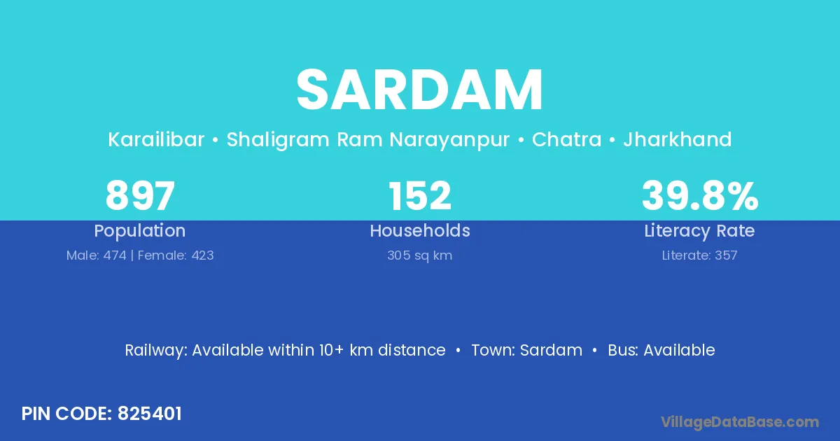 Sardam village has a total population of 897 people, of which 474 are males and 423 are females.