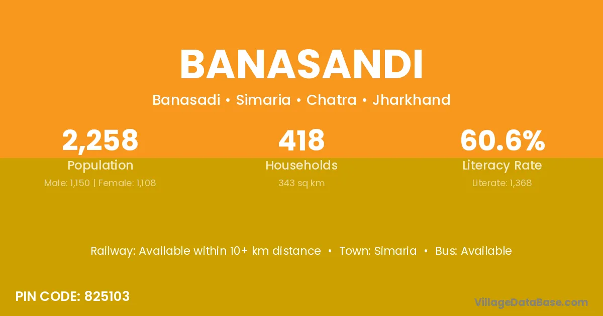 Banasandi village has a total population of 2,258 people, of which 1,150 are males and 1,108 are females.