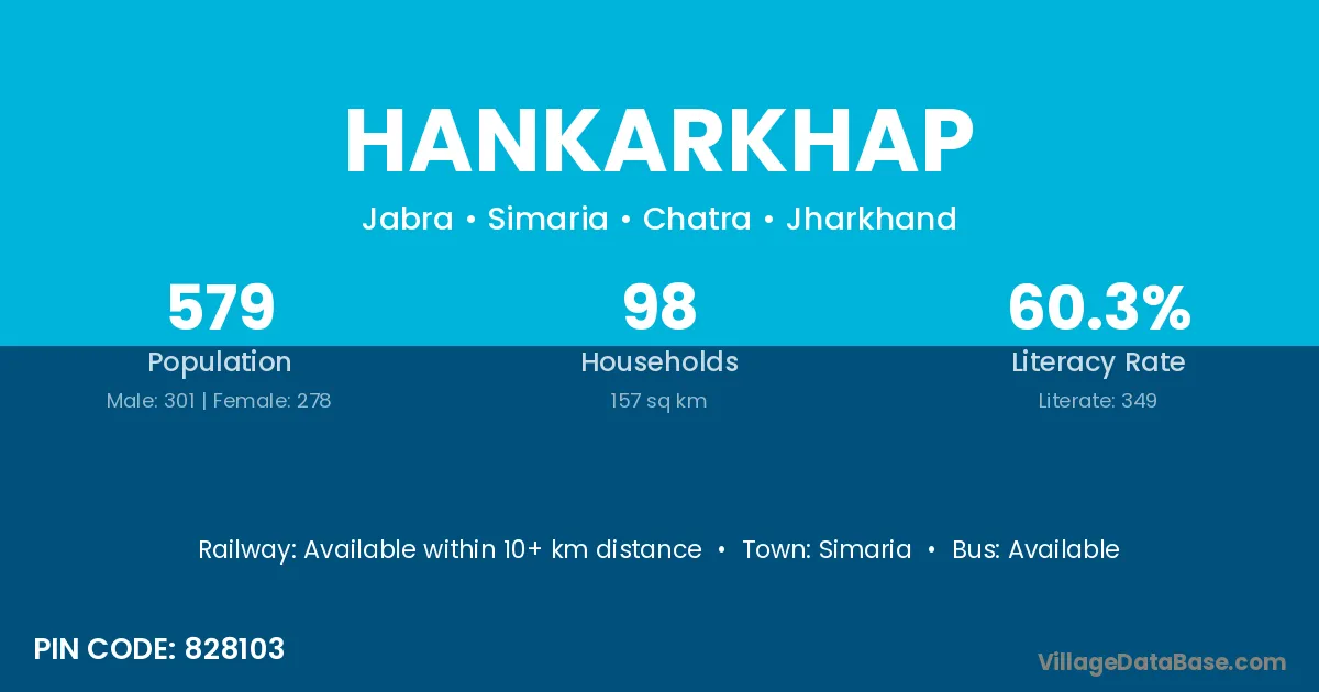 Hankarkhap village has a total population of 579 people, of which 301 are males and 278 are females.