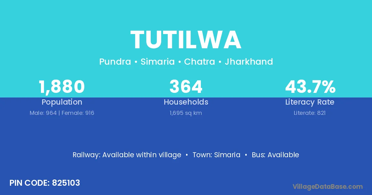Tutilwa village has a total population of 1,880 people, of which 964 are males and 916 are females.