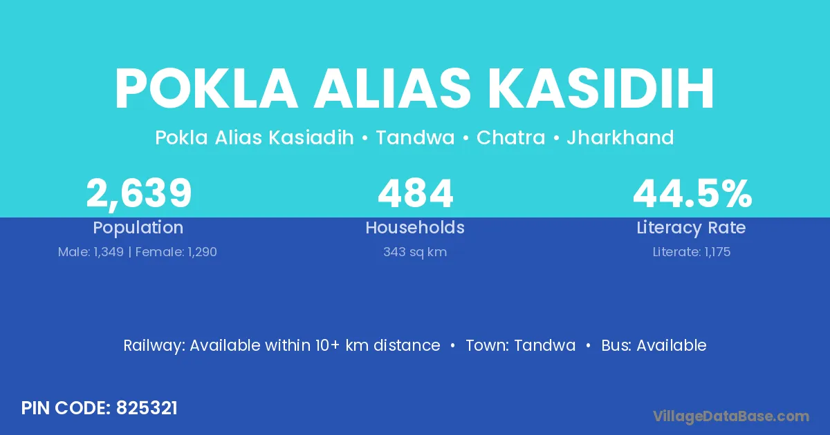 Pokla Alias Kasidih village has a total population of 2,639 people, of which 1,349 are males and 1,290 are females.