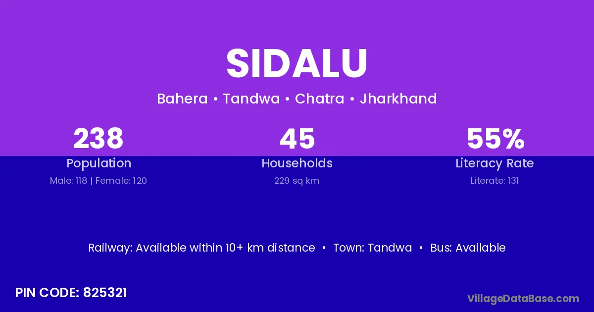 Sidalu village has a total population of 238 people, of which 118 are males and 120 are females.