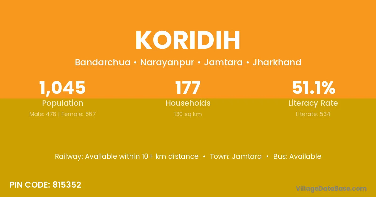 The literacy rate of Koridih village is 51.33%. Male literacy stands at 62.26% and female literacy at 39.01%.