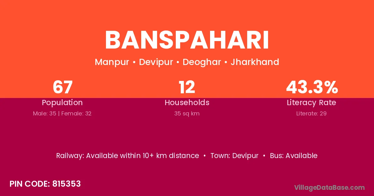 Banspahari village has a total population of 67 people, of which 35 are males and 32 are females.