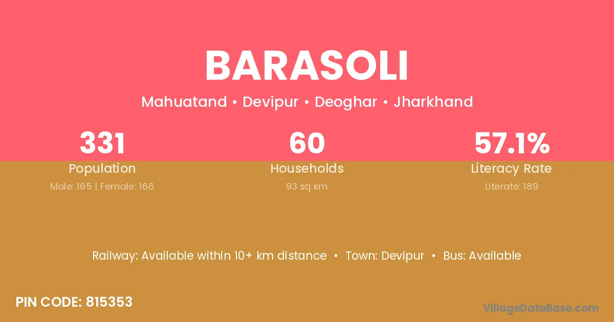Barasoli village has a total population of 331 people, of which 165 are males and 166 are females.