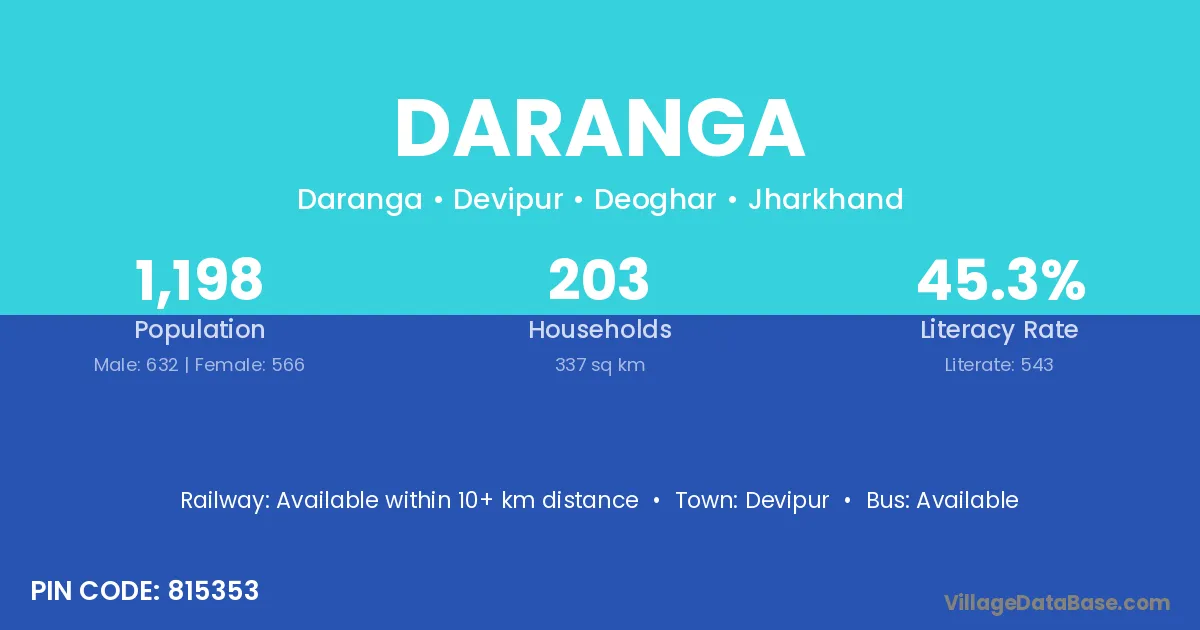 Daranga village has a total population of 1,198 people, of which 632 are males and 566 are females.