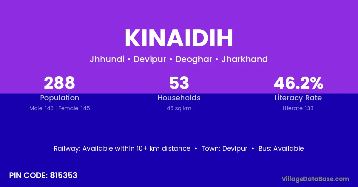 Kinaidih village has a total population of 288 people, of which 143 are males and 145 are females.