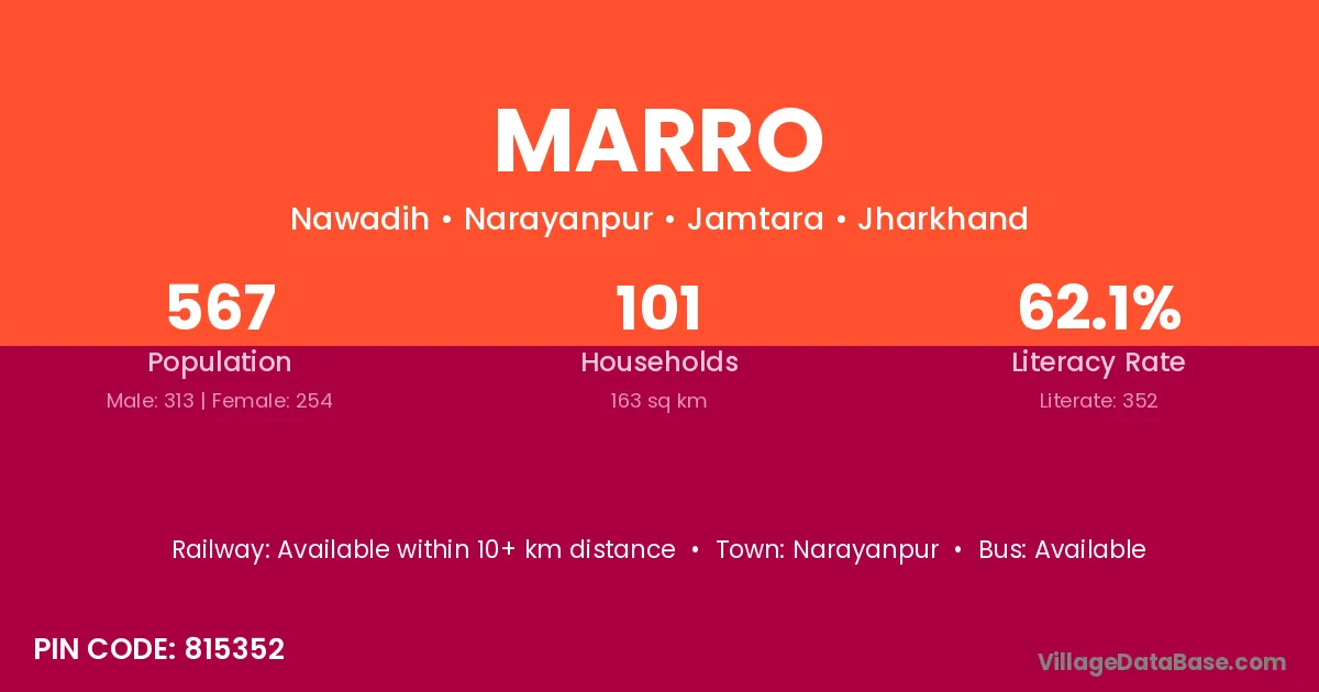 The literacy rate of Marro village is 41.72%. Male literacy stands at 50.82% and female literacy at 31.64%.