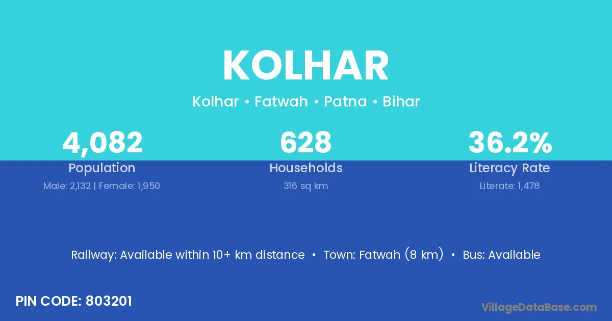 The literacy rate of Kolhar village is 44.66%. Male literacy stands at 55.24% and female literacy at 32.96%.