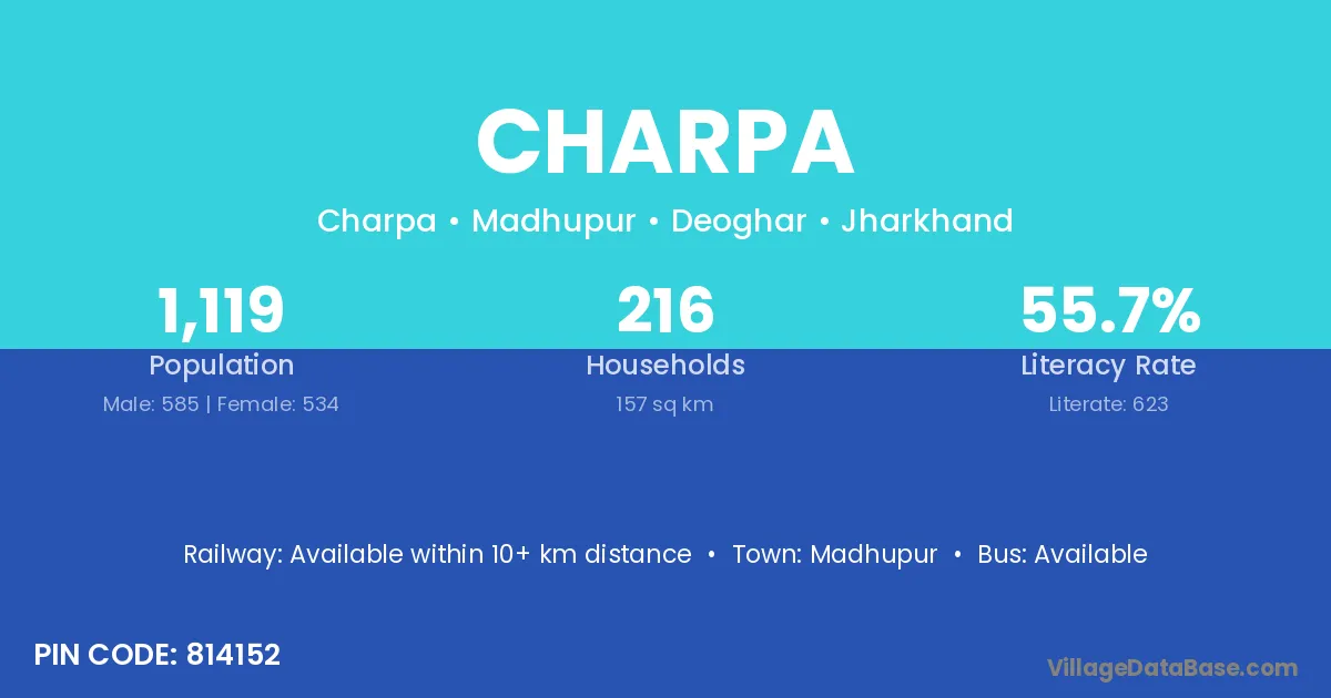 Charpa village has a total population of 1,119 people, of which 585 are males and 534 are females.