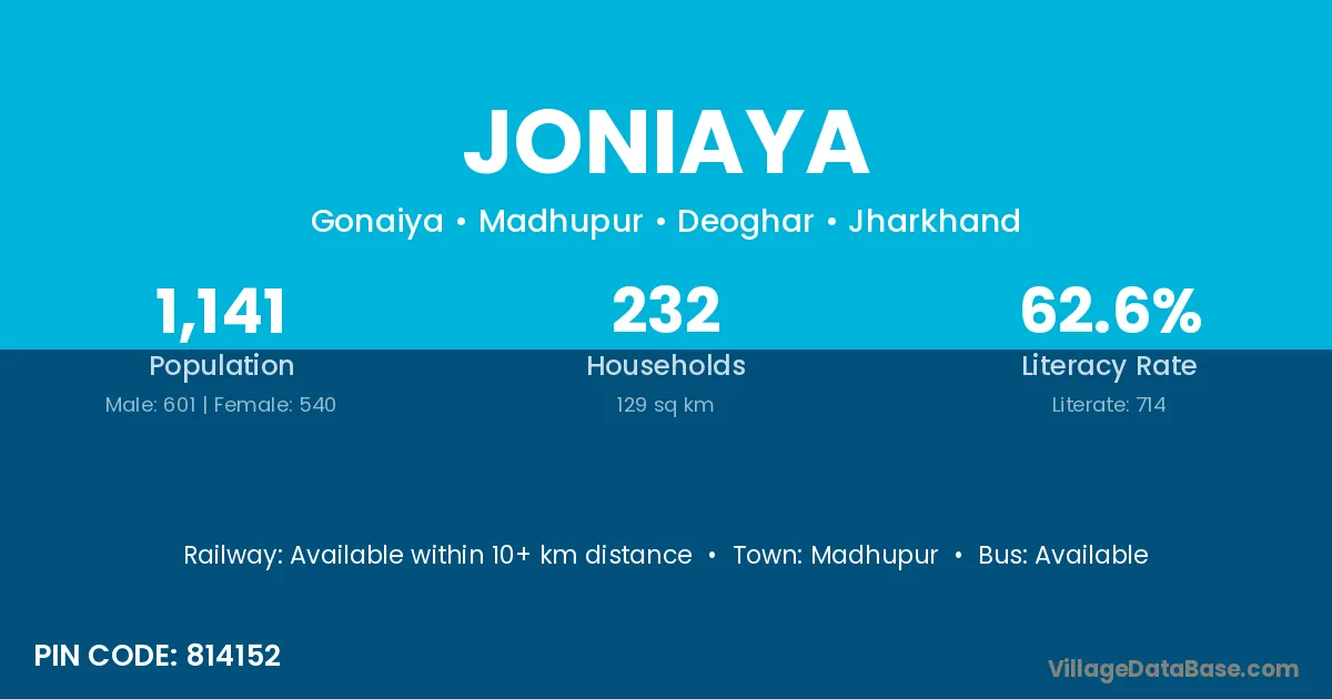 Joniaya village has a total population of 1,141 people, of which 601 are males and 540 are females.