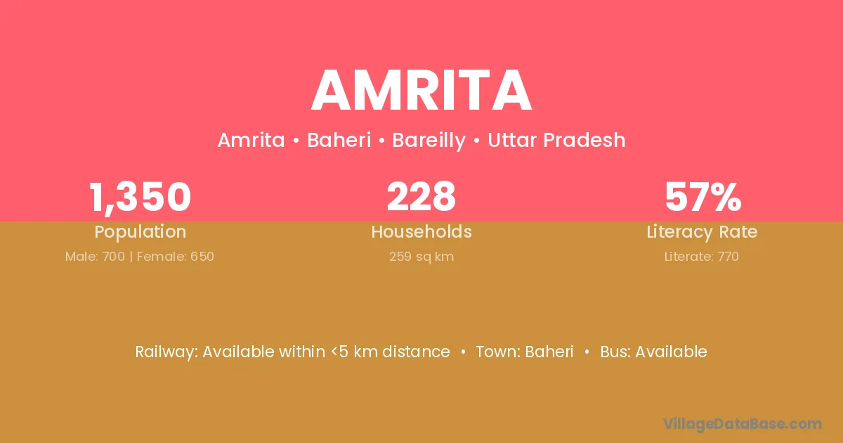 The literacy rate of Amrita village is 58.23%. Male literacy stands at 68.12% and female literacy at 45.95%.