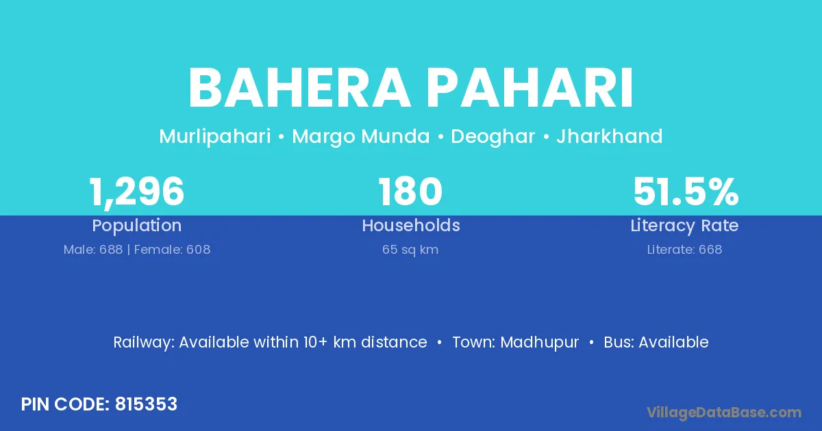 Bahera Pahari village has a total population of 1,296 people, of which 688 are males and 608 are females.