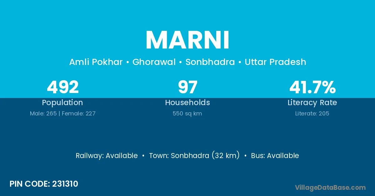 The literacy rate of Marni village is 37.57%. Male literacy stands at 52.09% and female literacy at 22.42%.