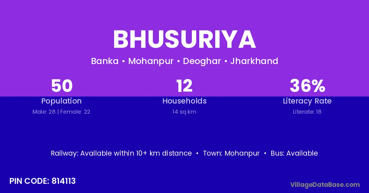 Bhusuriya village has a total population of 50 people, of which 28 are males and 22 are females.