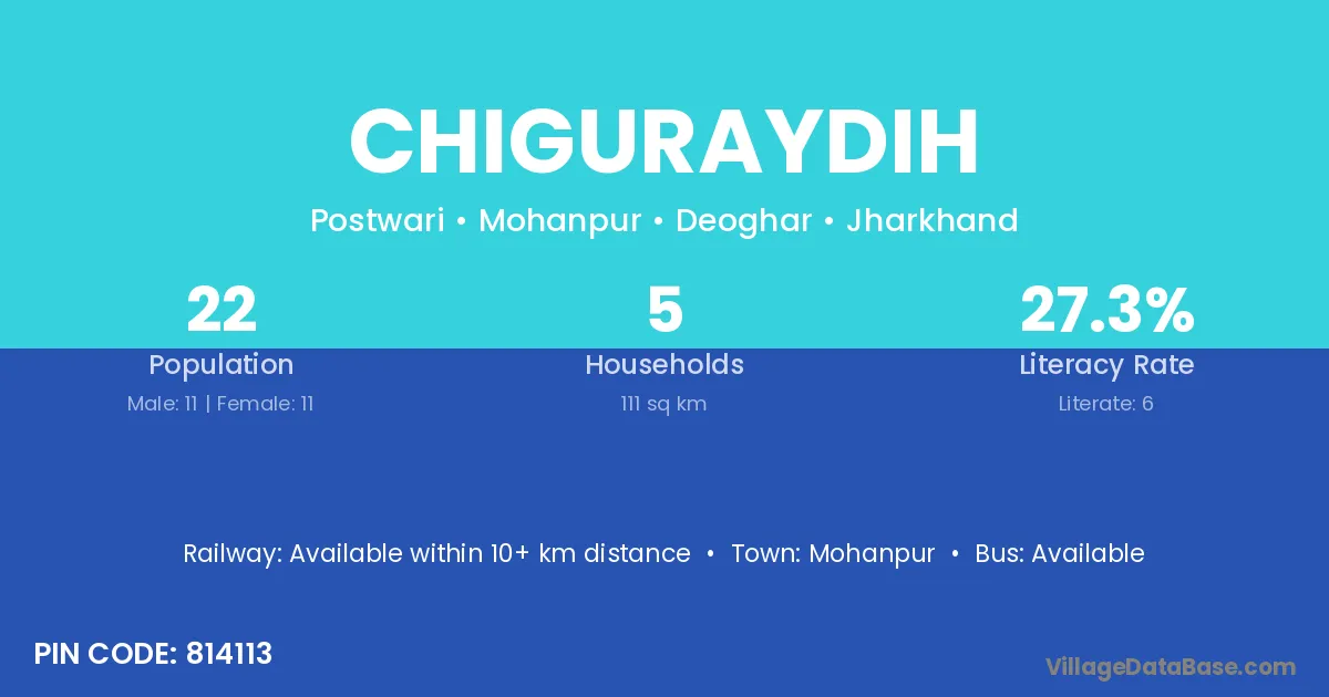 Chiguraydih village has a total population of 22 people, of which 11 are males and 11 are females.