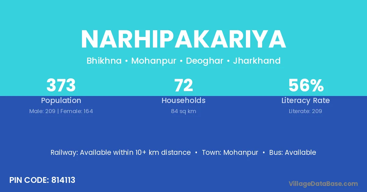 Narhipakariya village has a total population of 373 people, of which 209 are males and 164 are females.