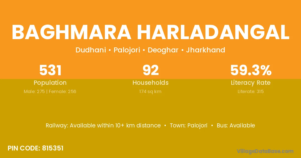 Baghmara Harladangal village has a total population of 531 people, of which 275 are males and 256 are females.