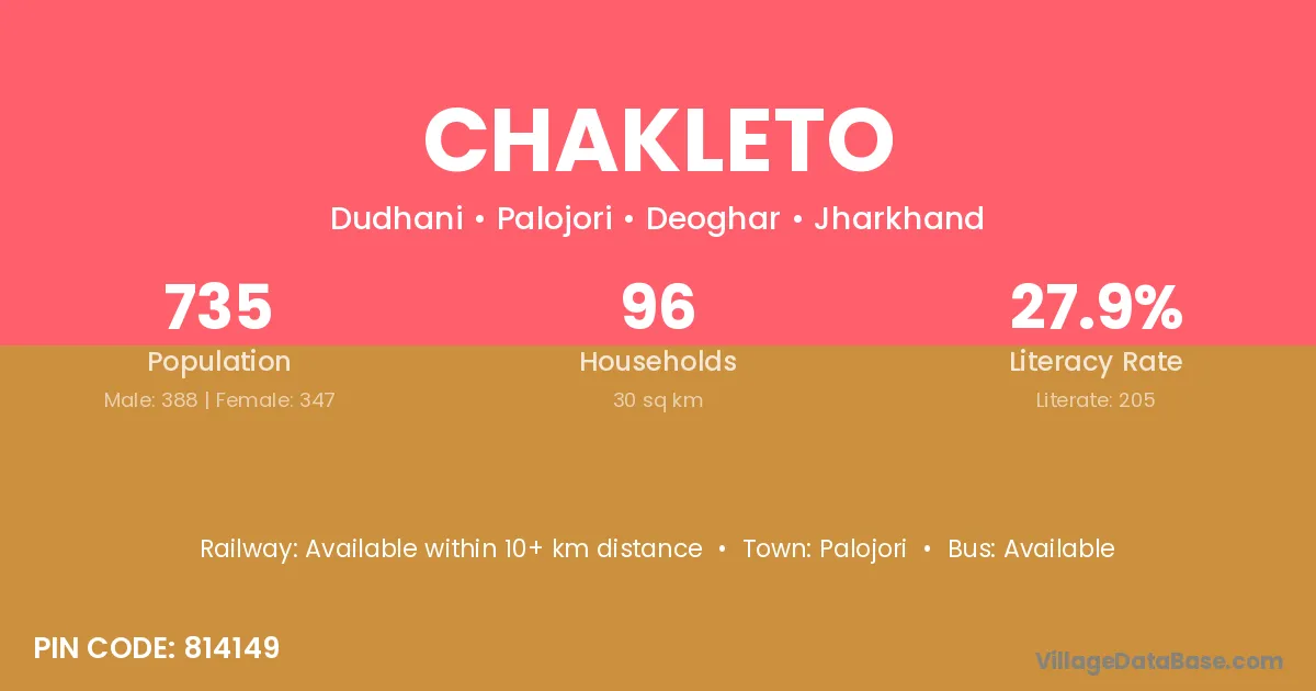 Chakleto village has a total population of 735 people, of which 388 are males and 347 are females.