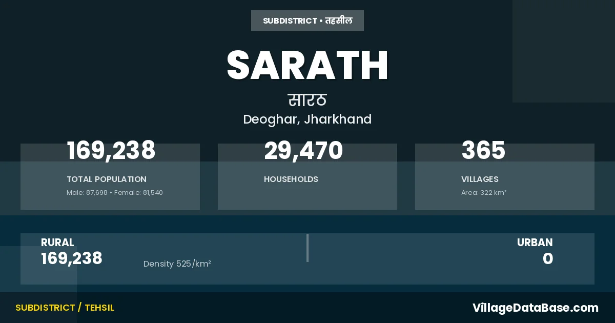 According to the 2011 census The total area of Sarath Subdivision is 322 km², with a population of 169238 people. The population density is 525 inhabitants per square kilometre, and there are approximately 29470 houses in the sub district.