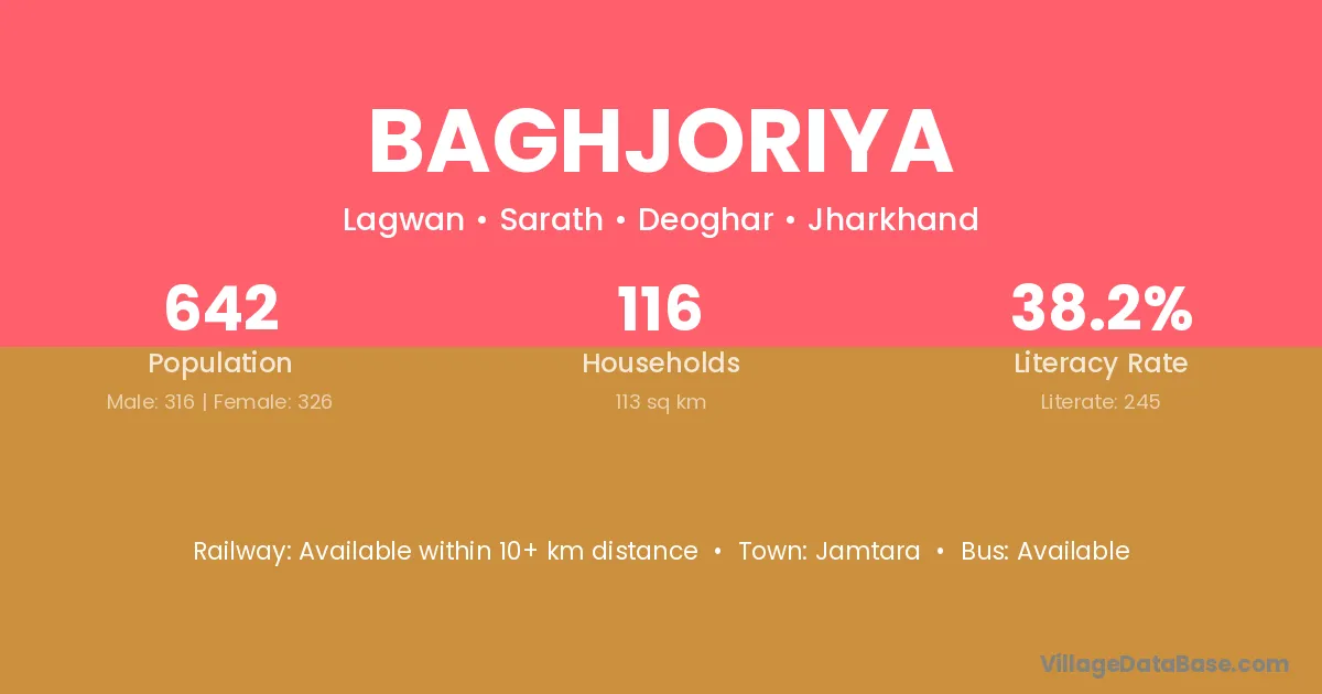 Baghjoriya village has a total population of 642 people, of which 316 are males and 326 are females.