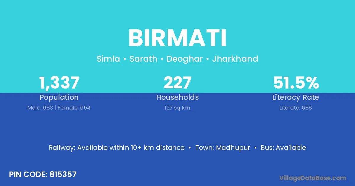 Birmati village has a total population of 1,337 people, of which 683 are males and 654 are females.
