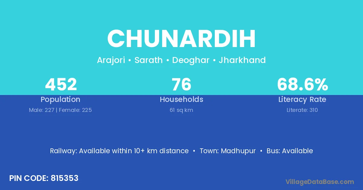 Chunardih village has a total population of 452 people, of which 227 are males and 225 are females.