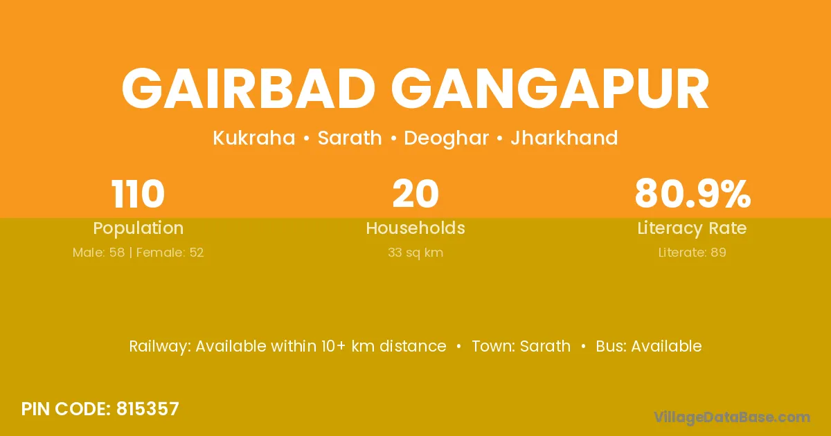 Gairbad Gangapur village has a total population of 110 people, of which 58 are males and 52 are females.