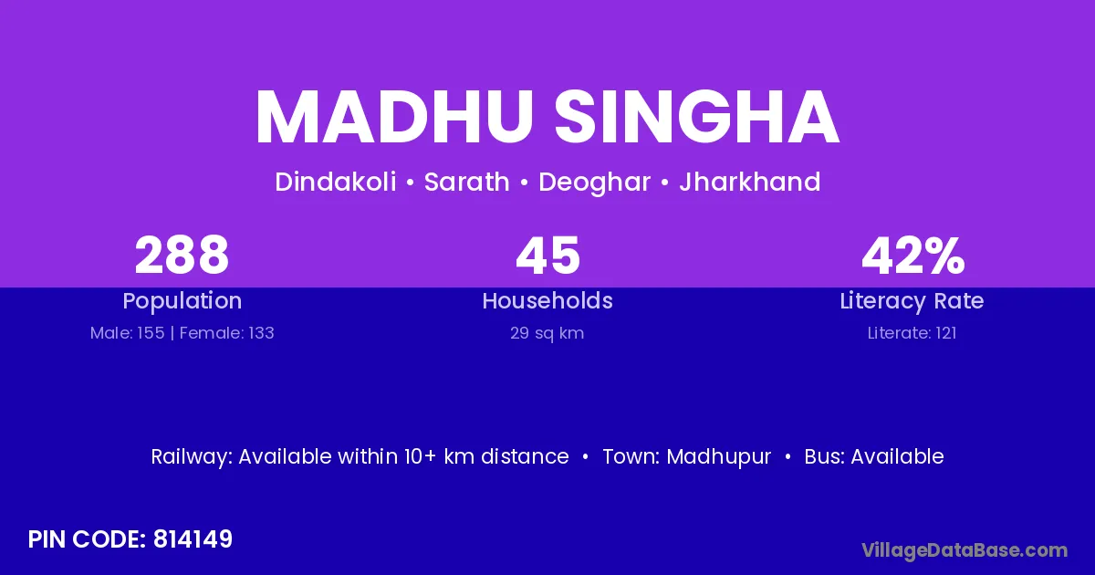 Madhu Singha village has a total population of 288 people, of which 155 are males and 133 are females.