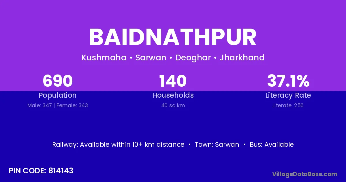 Baidnathpur village has a total population of 690 people, of which 347 are males and 343 are females.