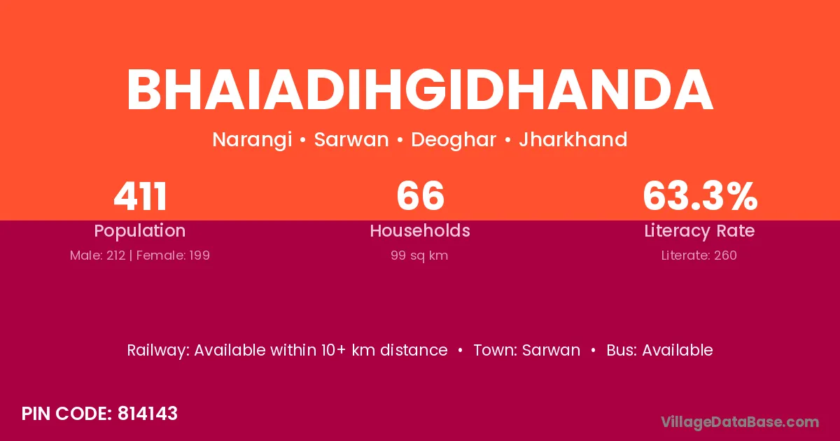 Bhaiadihgidhanda village has a total population of 411 people, of which 212 are males and 199 are females.