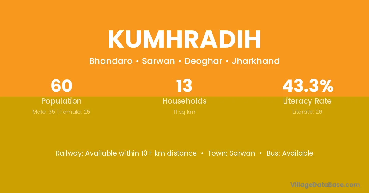 Kumhradih village has a total population of 60 people, of which 35 are males and 25 are females.
