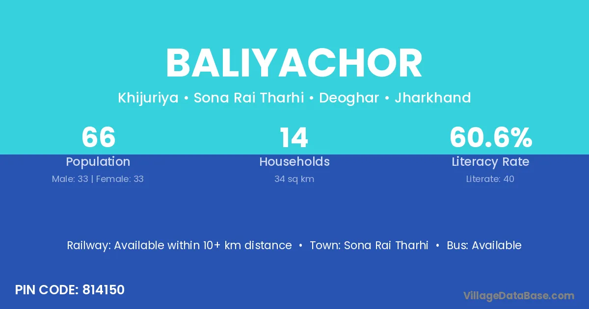 Baliyachor village has a total population of 66 people, of which 33 are males and 33 are females.
