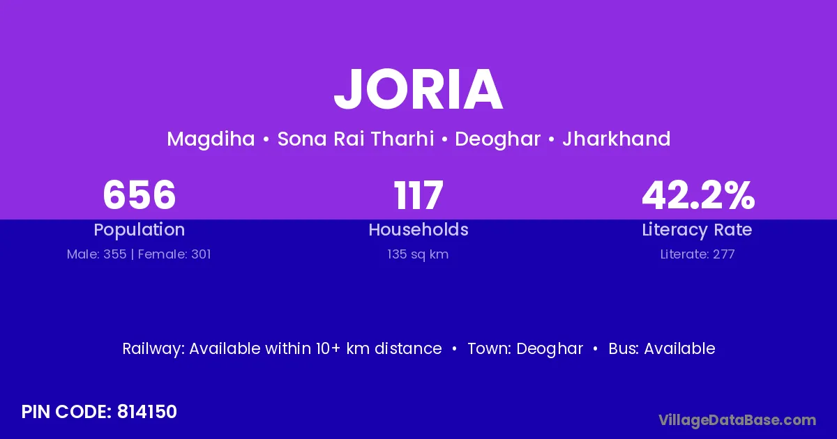 Joria village has a total population of 656 people, of which 355 are males and 301 are females.