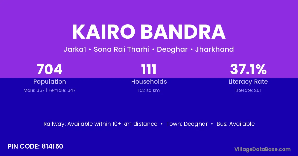 Deoghar is the nearest town to Kairo Bandra village for major economic activities