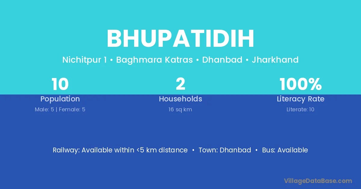 Bhupatidih village has a total population of 10 people, of which 5 are males and 5 are females.