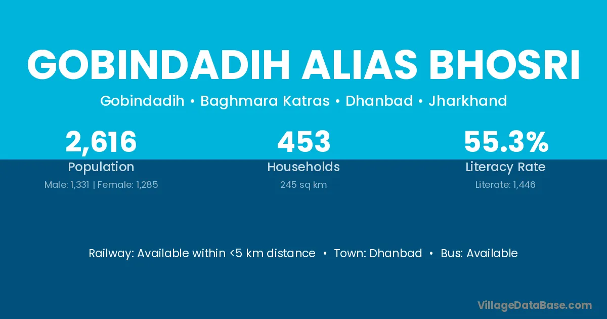 Gobindadih Alias Bhosri village has a total population of 2,616 people, of which 1,331 are males and 1,285 are females.