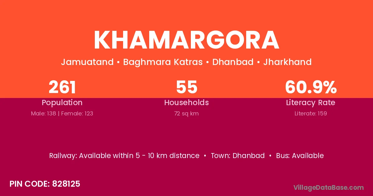 Khamargora village has a total population of 261 people, of which 138 are males and 123 are females.