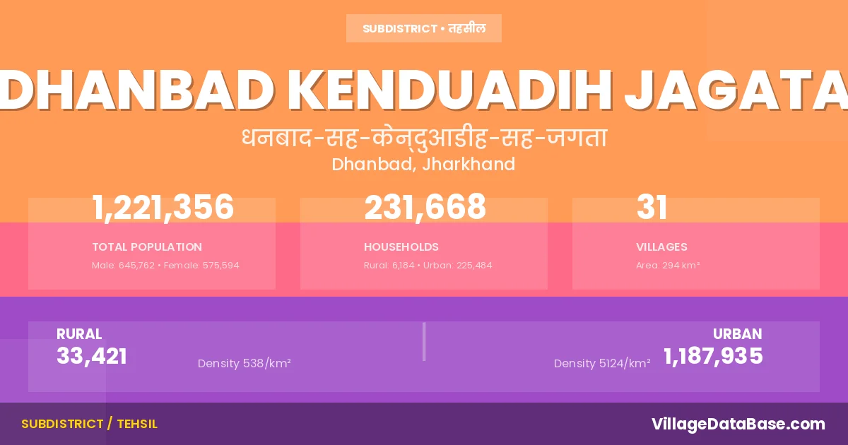 According to the 2011 census The total area of Dhanbad Kenduadih Jagata Subdivision is 294 km², with a population of 1221356 people. The population density is 4,155 inhabitants per square kilometre, and there are approximately 231668 houses in the sub district.