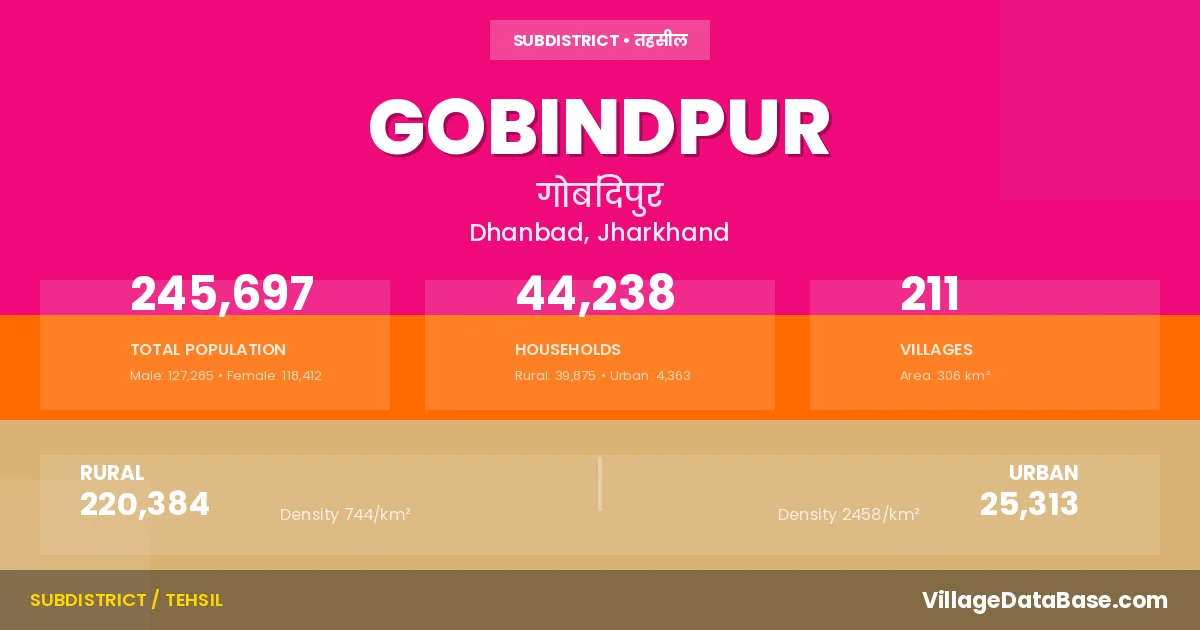 According to the 2011 census The total area of Gobindpur Subdivision is 306 km², with a population of 245697 people. The population density is 802 inhabitants per square kilometre, and there are approximately 44238 houses in the sub district.