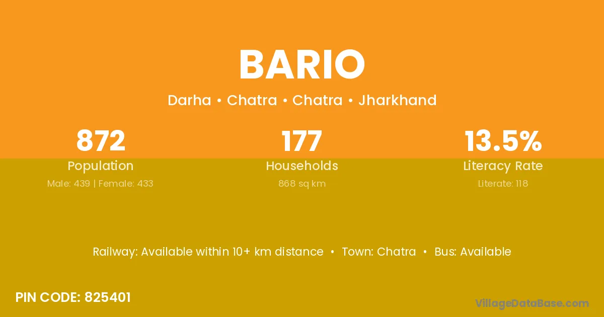 The literacy rate of Bario village is 51.85%. Male literacy stands at 58.97% and female literacy at 43.90%.